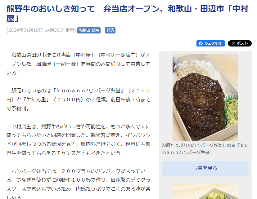中村屋について メディア情報 店主プロフィール 中村屋について 和歌山100%をどうぞ! 地元和歌山のおいしい自然をギュッと詰め込んだ肉弁当。名物熊野牛を使った「kumanoハンバーグ弁当」はつなぎを使わず100%熊野牛を使ったハンバーグ弁当です。試行錯誤を重ねた焼き加減と配合が奏でるジューシーな肉肉しさをお楽しみいただける逸品!大満足200gのボリュームで、驚きの食べごたえをぜひ堪能してみてください! ご予約はWebから お弁当はご予約いただいた数だけを、当日おつくりしております。当日予約なしでお越しの場合は、在庫が残っていればお作りすることも可能ですが、残っていないと「ごめんなさい…」となってしまうことも。お越しの際は事前のご予約お願いします! メディア情報 AGARA紀伊民放に掲載されました! 店主プロフィール 名前 中村 功一朗 ひとこと 地域の自然に育まれた、豊かな食材を活かしたスタイルで料理を創作しています。地元の味を大切にしながら、新しい食の体験をご提供。ローカルな農家さんとの連携を大切にし、地域社会との絆も大切にしています。お弁当を通じて、地元の食材のおいしさと品質をお届けできるように、これからも努力してまいります。